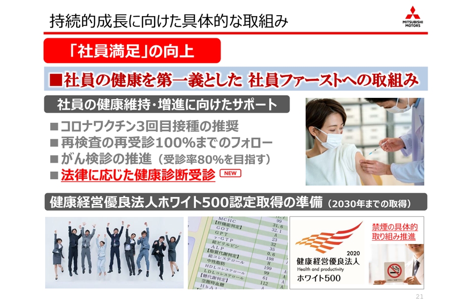・定期健康診断及び2次健診の100%受診 ・がん健診の受診率向上及び2次健診の100%受診 ・特定保健指導の実施 ・受動喫煙対策の徹底(喫煙所の運営状況の定期確認) ・コロナワクチン接種の推奨 ・社員満足の向上(社員アンケートの実施、社員相談室対応) ・女性活躍機会の拡充 ・職制・職務別教育と成果・貢献度に応じた評価 ・ワークライフバランス拡充による離職防止と積極採用 |