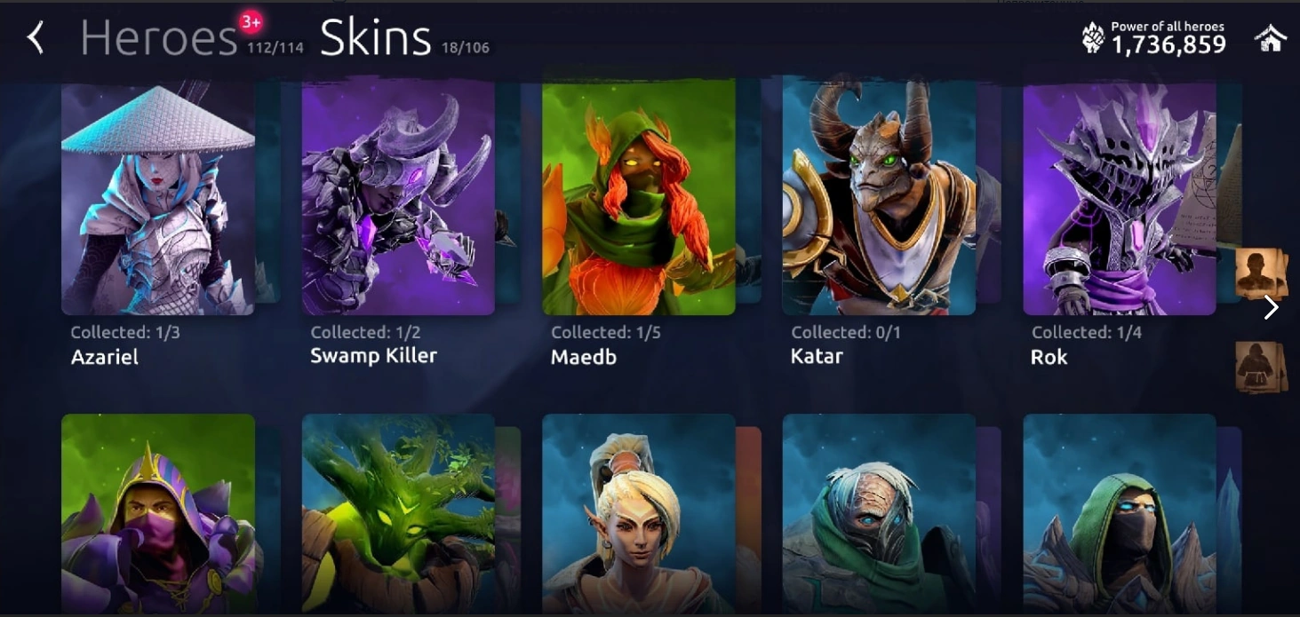 There are standard skins of heroes and a number of sets with thematic skins in the game. We can buy the skins in the pass shop, soulwarden shop, they are available in magic pass, we can buy it in some event for gold or special currency. Champion set can be obtained by taking first place in the events. Unavailable skins are highlighted in gray and have a lock on them.
