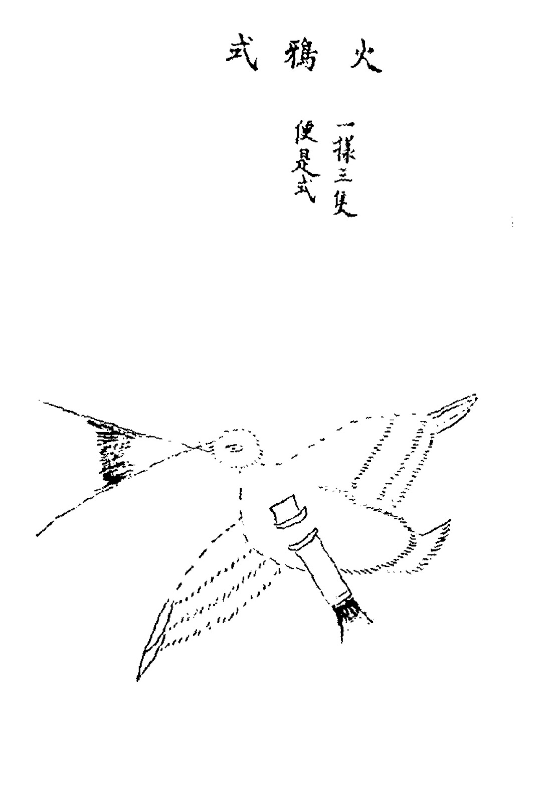 It should be noted that the illustration above contains numerous glaring errors, and shouldn't be taken at face value. For example, the illustration depicts a lifelike crow complete with feathery wings and legs, even though the text clearly describes a simply constructed paper model bird. Besides, the rockets are all mounted at the wrong places, and come with unnecessary stabilising sticks and fins (not mentioned in the text). It is most likely that the author of Wu Bei Zhi heard about this weapon from unreliable sources and hearsay, and reproduced it incorrectly in his military treatise.