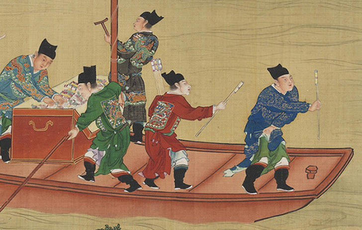 | Section of the scroll painting 'Ru Bi Tu (《入蹕圖》)', depicting Emperor Shenzong's entourage launching bottle rockets into the sky. |