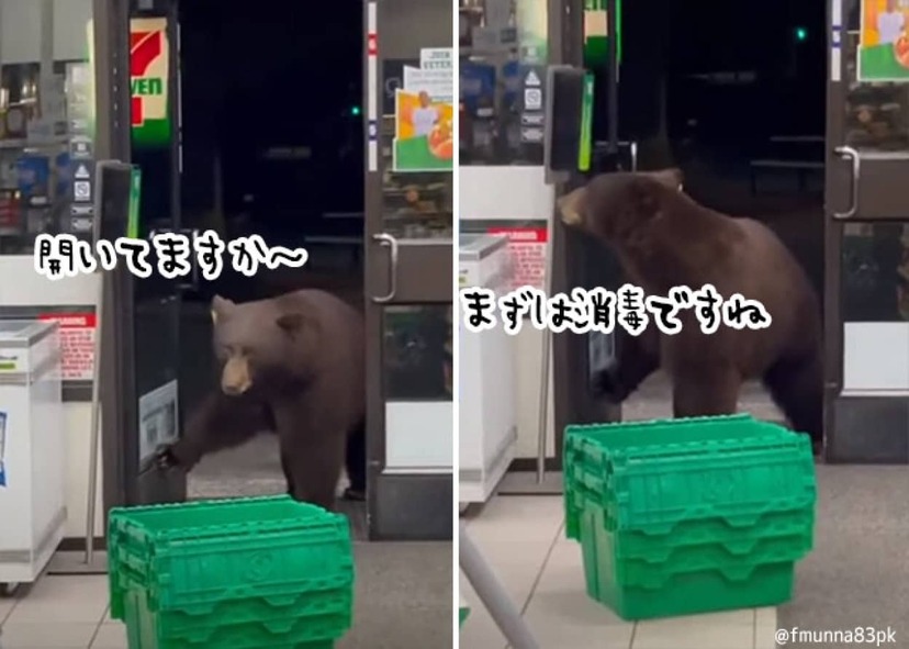 夜のセブンイレブンにやってきたのは1頭の熊。開いてますか~?とばかりにドアを開けて入ってきた。