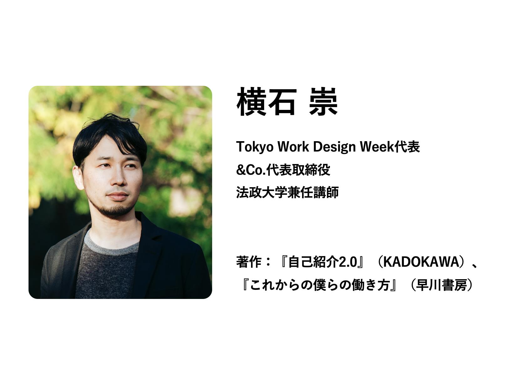 はじめまして。働き方の祭典「Tokyo Work Design Week」代表の横石と申します。個の時代における新しい働き方の実践にまつわる活動を中心にしています。