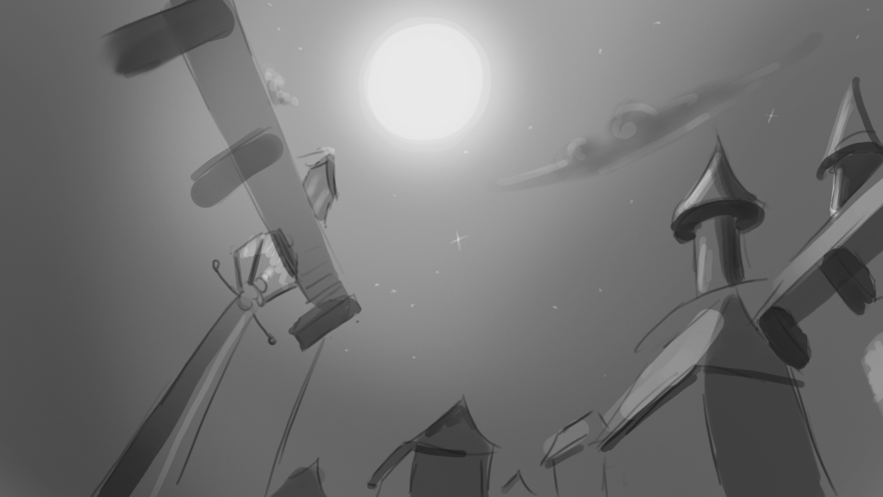 We did like five or six compositions for this scene counting thumbnails and digital media.  This is one of my attempts to it , but it really didn't worked in a sequence. Because the beat was too fast. The idea was to show that there is more than one pony under the bridge, which are not reacting to Luna's song, but the foal get's "called" by the moonbean  just like the others.