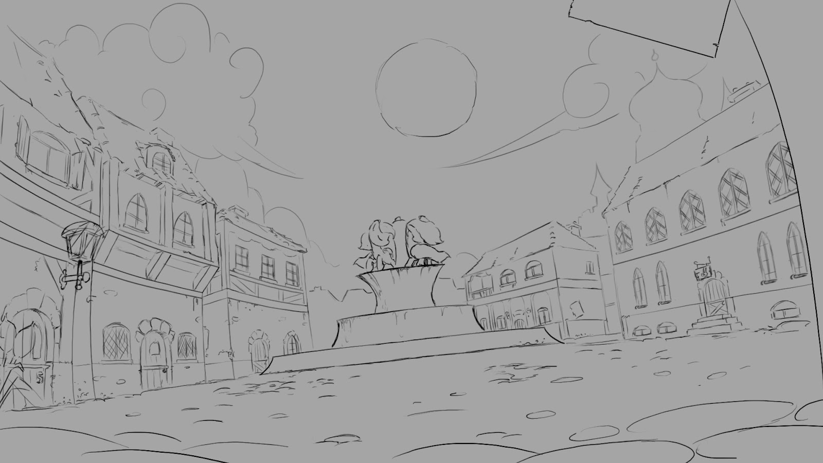 All this work finally lead to the depiction of Ye Olde Canterlot, as you can see in this Layout sketch
