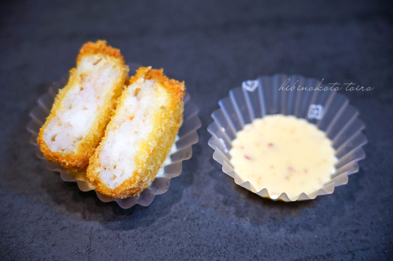 エビカツには、スイートチリソースとマヨネーズを1:1で合わせたスイートチリマヨがめちゃ合うよ。