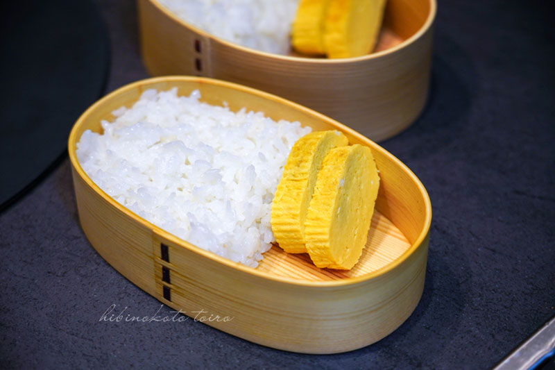 お弁当箱にご飯を詰めたら、卵焼きを詰めます。