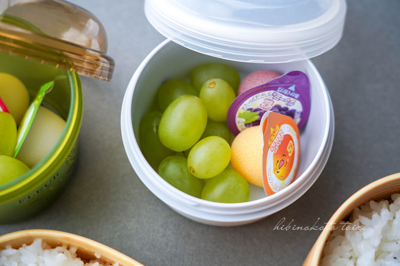 うちは、デザート(果物とかゼリー)が欲しいって思ってる子たちなので、毎日何かしら入れるようにしているのですが、今日は皮ごと食べられるブドウと凍らせたゼリー。