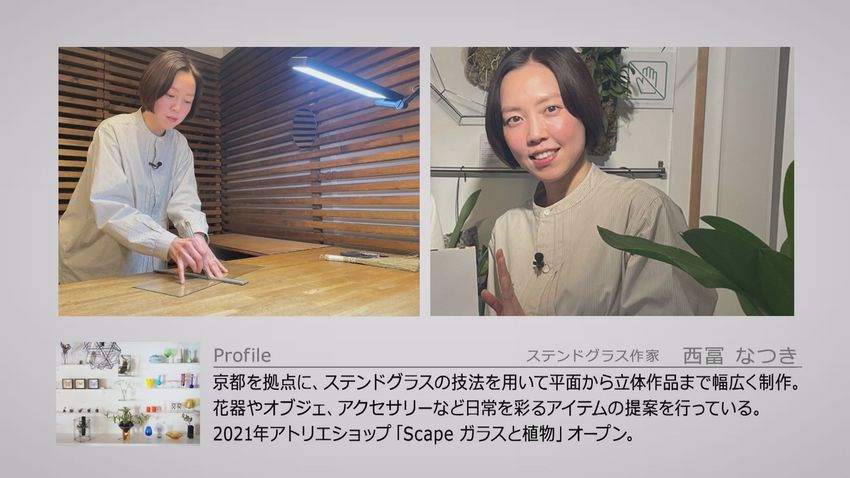 京都を拠点に、ステンドグラスの技法を用いて平面から立体作品まで幅広く制作。花器やオブジェ、アクセサリーなど日常を彩るアイテムの提案を行っている。2021年アトリエショップ「Scape ガラスと植物」オープン。2003年。京都精華大学デザイン学部に入学。プロダクトデザインに興味を持ち、暮らしの中で使う日用品を制作していた。2007年。卒業後は京都精華大学の学外アートスペース「shin-bi」で働きはじめ、アート・デザイングッズなどの販売やイベントなどの企画・プロデュースを行っていた。当時「自分も何かつくりたい」という欲はなく作家を応援する立場として働いていた。2010年。「shino-bi」が閉館。次はどういった仕事をしようと考えていた時、「やっぱり自分も何かを作りたい」と制作意欲が生まれる。陶芸や吹きガラスなど工芸系の体験講座に行く中で、ステンドグラス制作を体験したとき、自分の中でしっくりきて教室に通い始める。他の仕事をしながら趣味でステンドグラスの勉強をしていたが、2012年から独学で制作を始める。2014年に友人夫婦のギャラリーを借りて初個展を開催。人との輪が広がった事ももちろん。その中で新しいアイデアが生まれ、それが新たな創作意欲につながる良い連鎖が生まれ、作家として活動する自信に繋がっていった。その後も個展やイベントなど順調に作家活動を続けていたが、2019年。コロナウイルスの蔓延で活動は自粛。制作する意味みたいな所まで考えると、もやもやする事も多かった。何か行動を起こさないといけないと考えていた時、声をかけてくれたのが、初めて個展をしたギャラリーオーナーの友人夫婦。「ここを借りてアートショップをやってみたら?」と提案をうけ思い切って挑戦。まだ始めて2年目で色々と模索中ではあるが、コロナで切れてしまった交流の輪。そして、個展でステンドグラスに興味を持ってもらう事が多かったので、ワークショップなども行っていきたいと考えている。