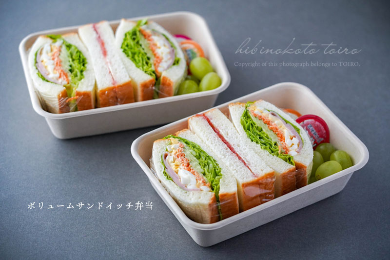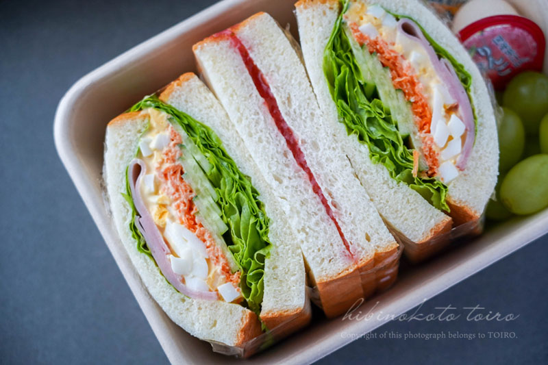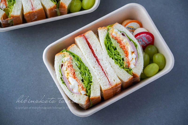サンドイッチ、全部用意できたら使い捨ての容器に詰めて出来上がり!!