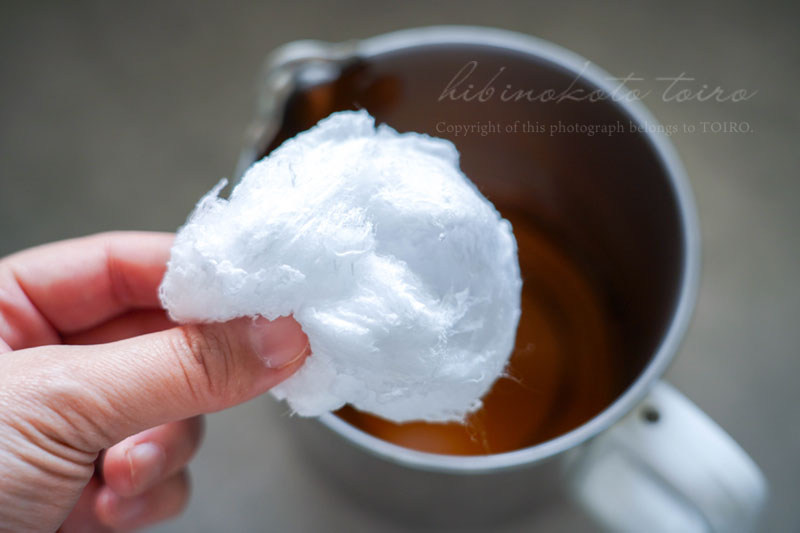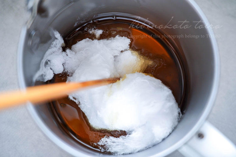 ちぎって入れたわたぐもを菜箸で油に馴染ませていくと、ぐいぐい油を吸っていくではないですか!