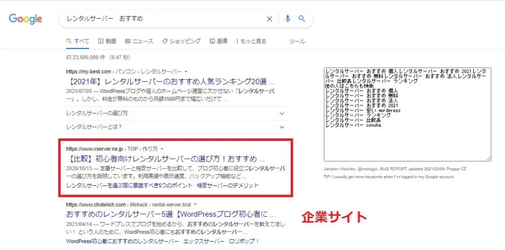 検索結果を確認する際、関連企業サイトは除外するようにしましょう。例えば「レンタルサーバー おすすめ」の検索結果には、エックスサーバーなどの企業サイトが上位表示されています。