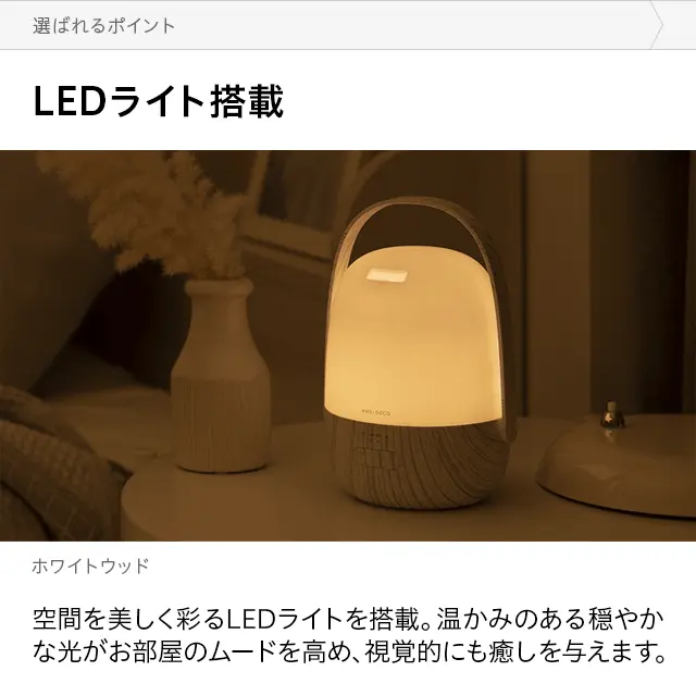 加湿しながら香りを楽しむアロマディフューザー アロマの香りとともに潤いも感じられる加湿機能付きアロマディフューザー。充電式のコードレスタイプで、場所を選ばずお好きな位置で利用可能。柔らかな光でお部屋を照らすLEDライトも搭載し、視覚からもリラックス気分を味わえます。