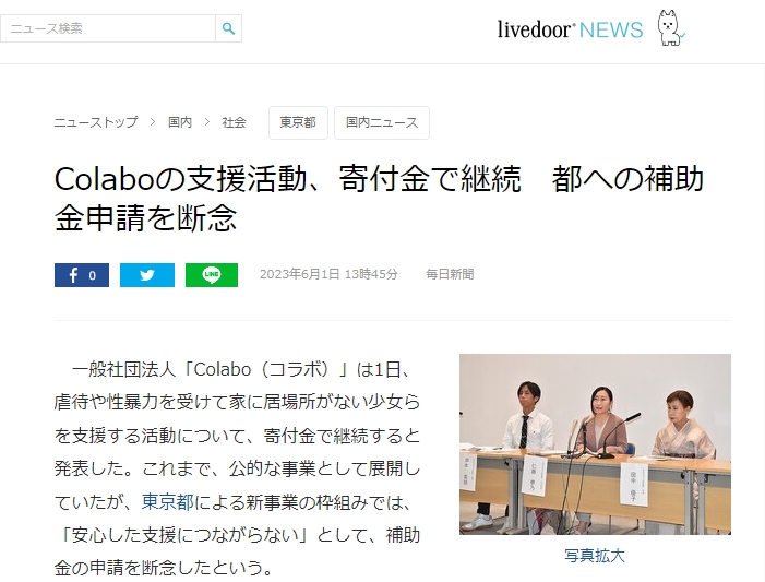 一般社団法人「Colabo(コラボ)」は1日、虐待や性暴力を受けて家に居場所がない少女らを支援する活動について、寄付金で継続すると発表した。
