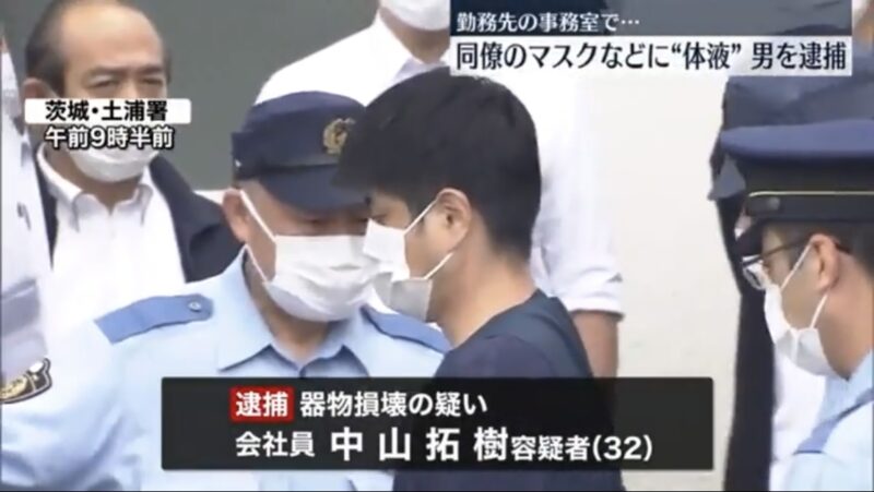 茨城県の同じ職場で働く20代の女性の作業着やマスクに体液をかけた疑いで、中山拓樹容疑者(なかやまひろき・32歳)が逮捕されました。