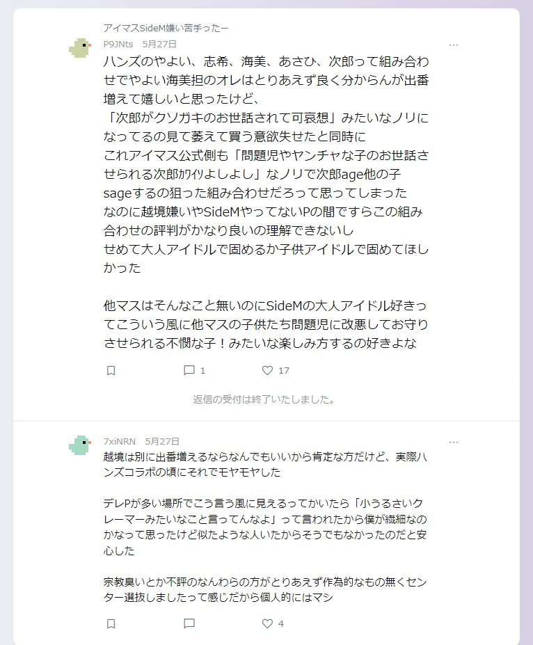 これアイマス公式側も「問題児やヤンチャな子のお世話させられる次郎カワイソよしよし」なノリで次郎age他の子sageするの狙った組み合わせだろって思ってしまった