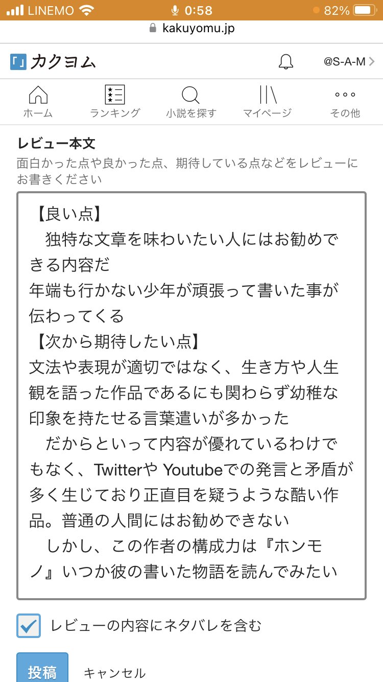 独特な文章表現を賞賛した上で、文脈や言葉遣いが適切で無く幼稚に見えてしまう。という評価をさせて貰ったのですが、本人様のプライドが許さなかったのか、削除されてしまいました