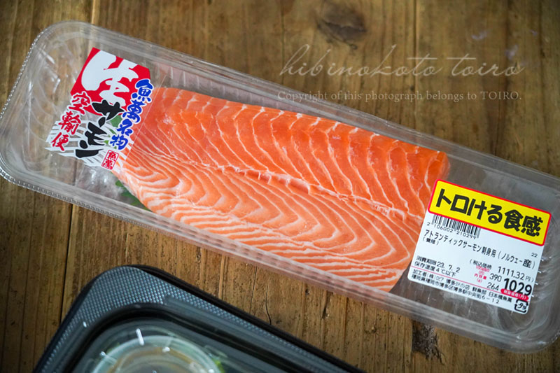 あ、あとねサーモンのお刺身が大きくて美味しそうだったから明日のご飯に使おうと買いました。