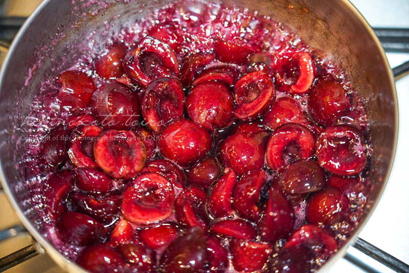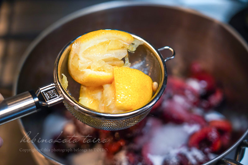 種を取ったアメリカンチェリーは半分にカットして鍋に入れました。