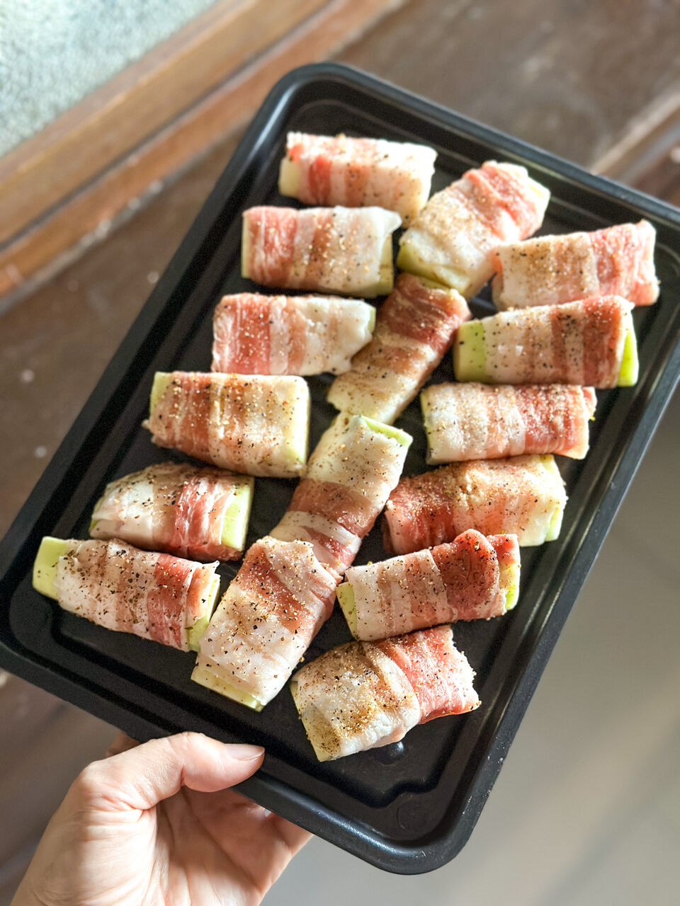 しゃぶしゃぶ用の豚バラ肉を巻き付けて、スパイスソルトをしっかりめにふりかけてから