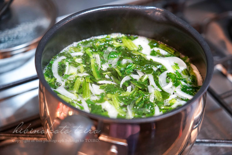 麺を煮るときに、タマネギの薄切りと冷凍ほうれん草をどかっと入れちゃう。