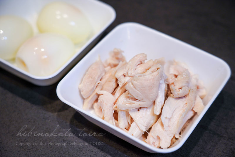 ほうれん草、タマネギ、鶏ササミにゆで卵。