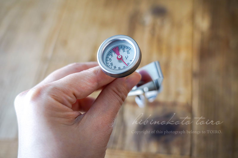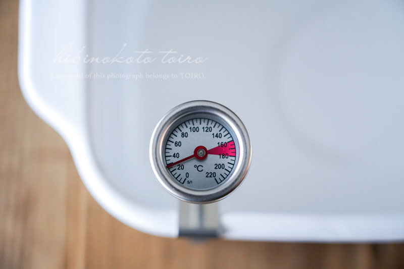 温度計は下についてしまわないように、かつ油の真ん中に先端が来るように調節してくださいね。