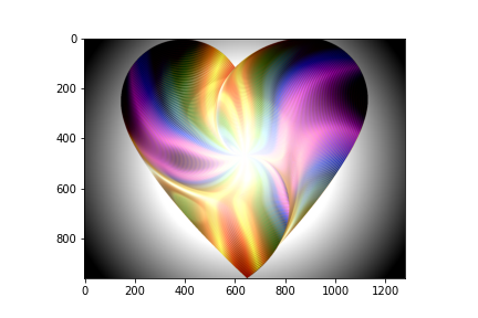 Q81の円形グラデーションを使いまわし、alphaの値を0.65つまり、ref_imgである。ref_imgとvをリニアライトで合成しプロットせよ。かなり禍々しいハートが出てくるはずだ。