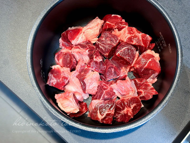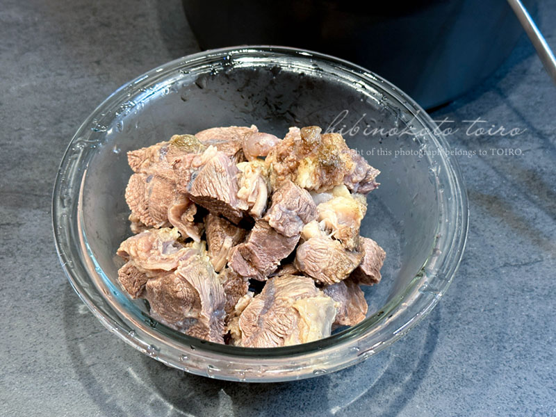 大きめの一口大にカットして、昼の間に電気圧力鍋で加圧20分して柔らかくするところまでやっておいたんです。