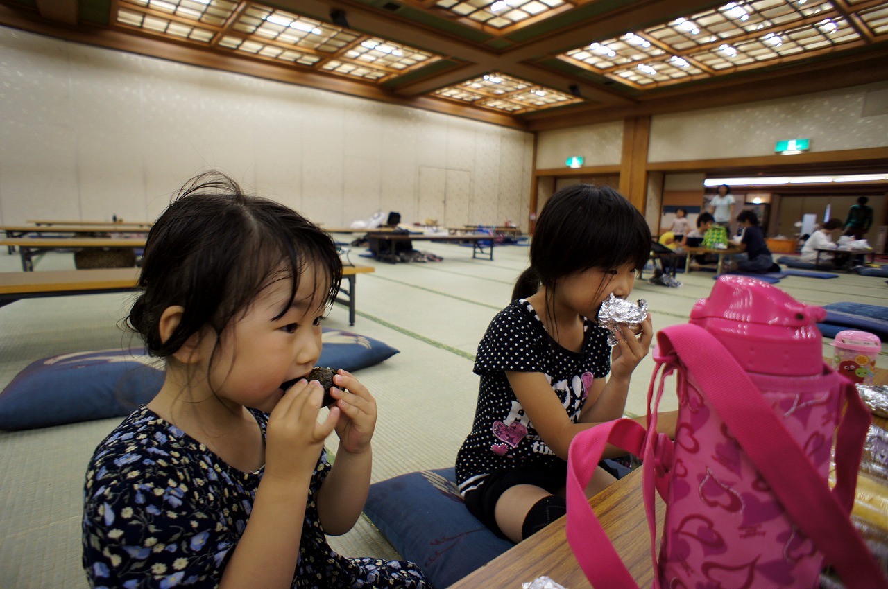 持参のおにぎりで遅めのランチ。今日はまばらな大広間も来週からはごったがえしちゃうんでしょうか?