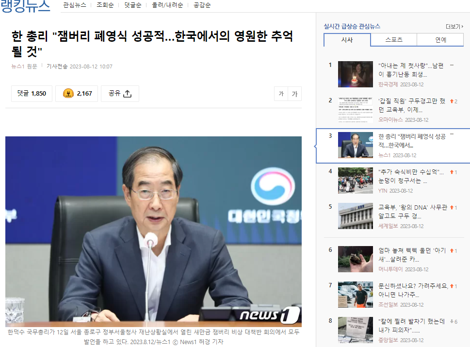 ハン首相は12日午前、ソウル鍾路区政府ソウル庁舎でジャンボリー緊急対策班会議を主宰した席で「昨日大規模移動と閉会式、そしてKポップ公演を成功裏に終えた」とこのように話した。