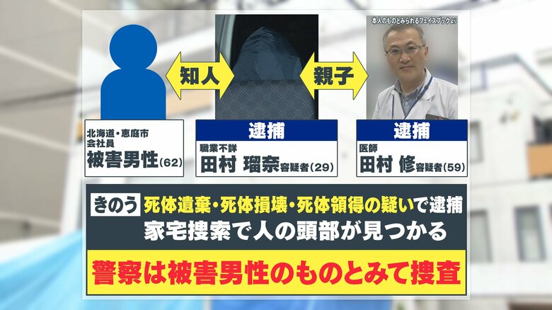 7月2日、札幌・ススキノのホテルで恵庭市に住む62歳の会社員の男性が、刃物のような物で首を切断された遺体で発見され、29歳の女と、医師で59歳の父親が逮捕された事件。