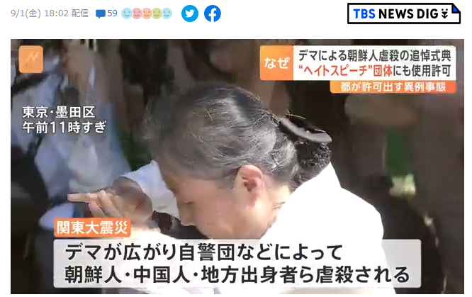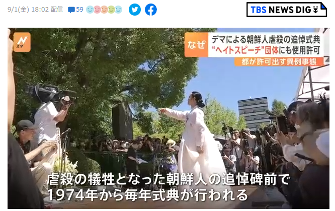 1: 名無しさん 2023/09/01(金) 18:54:21.65 ID:uJn+sNYF0 BE:718678614-2BP(1500)近年、人種差別的な発言=「ヘイトスピーチ」と認定される発言をした団体が式典を妨害する行為が問題となっていましたが、東京都は今年、この団体に朝鮮人追悼碑の前の敷地を使うことを許可するという異例の事態となりました。