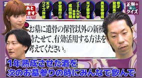 呂布カルマさんは「酒蔵にするのはどうですか?」と。一年熟成させたお酒を、次のお墓参りでみんなで飲むというアイデアに、「めっちゃいい!」と山添さん。