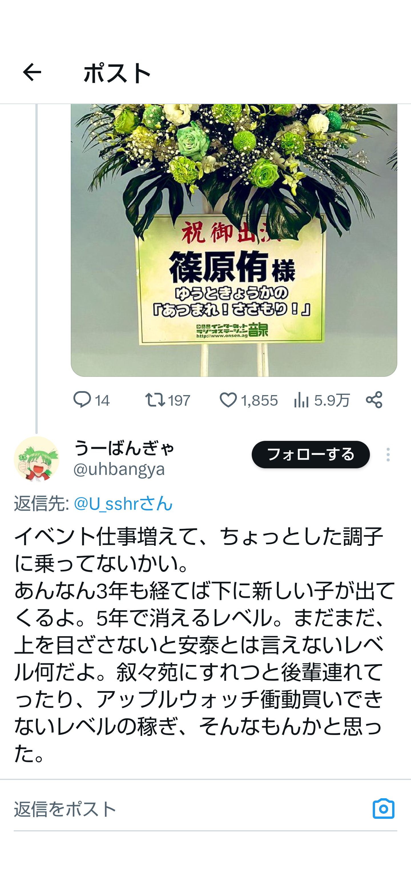のフラスタを送ったやつがリプライで発狂や