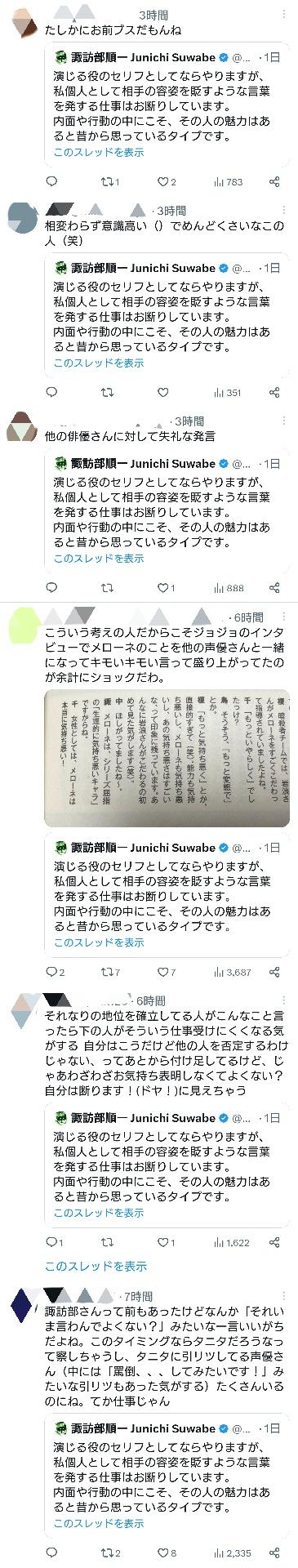 なんで諏訪部個人がやりたくないって言ってるだけなのに炎上するんだ? - 36二次元好きの匿名さん23/09/29(金) 18:49:48