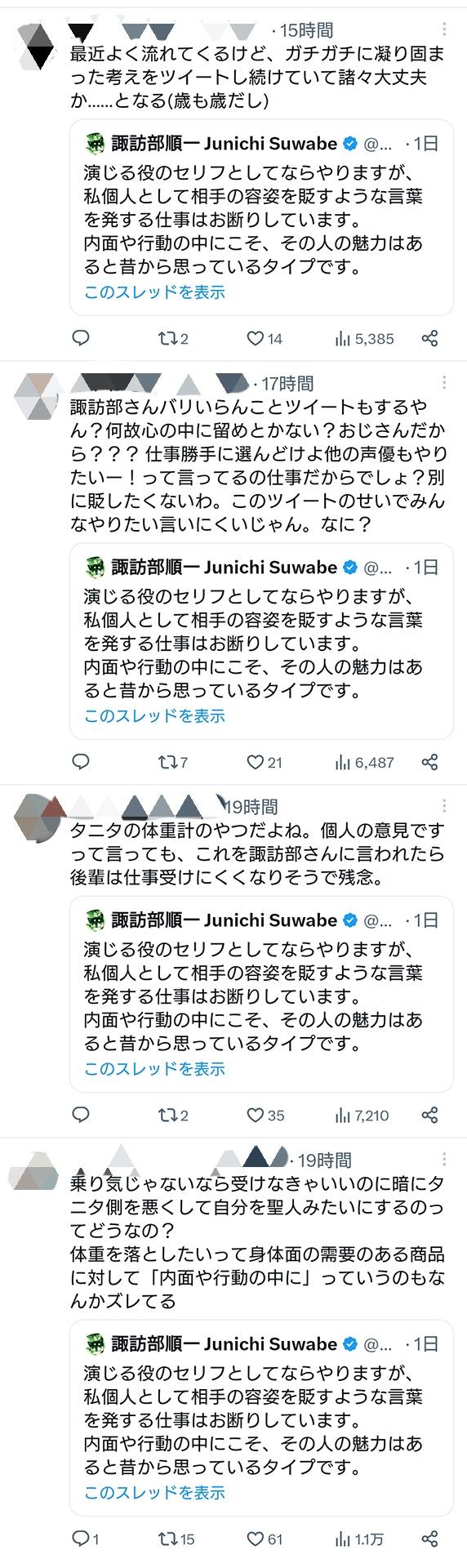 まぁ諏訪部が悪くないのは当たり前を超えた当たり前だけど直接タニタが諏訪部にレスポンスしてるわけじゃないからそもそも反応しなければよかったんじゃないスか?