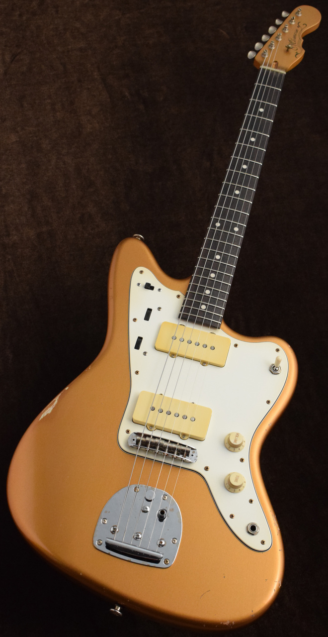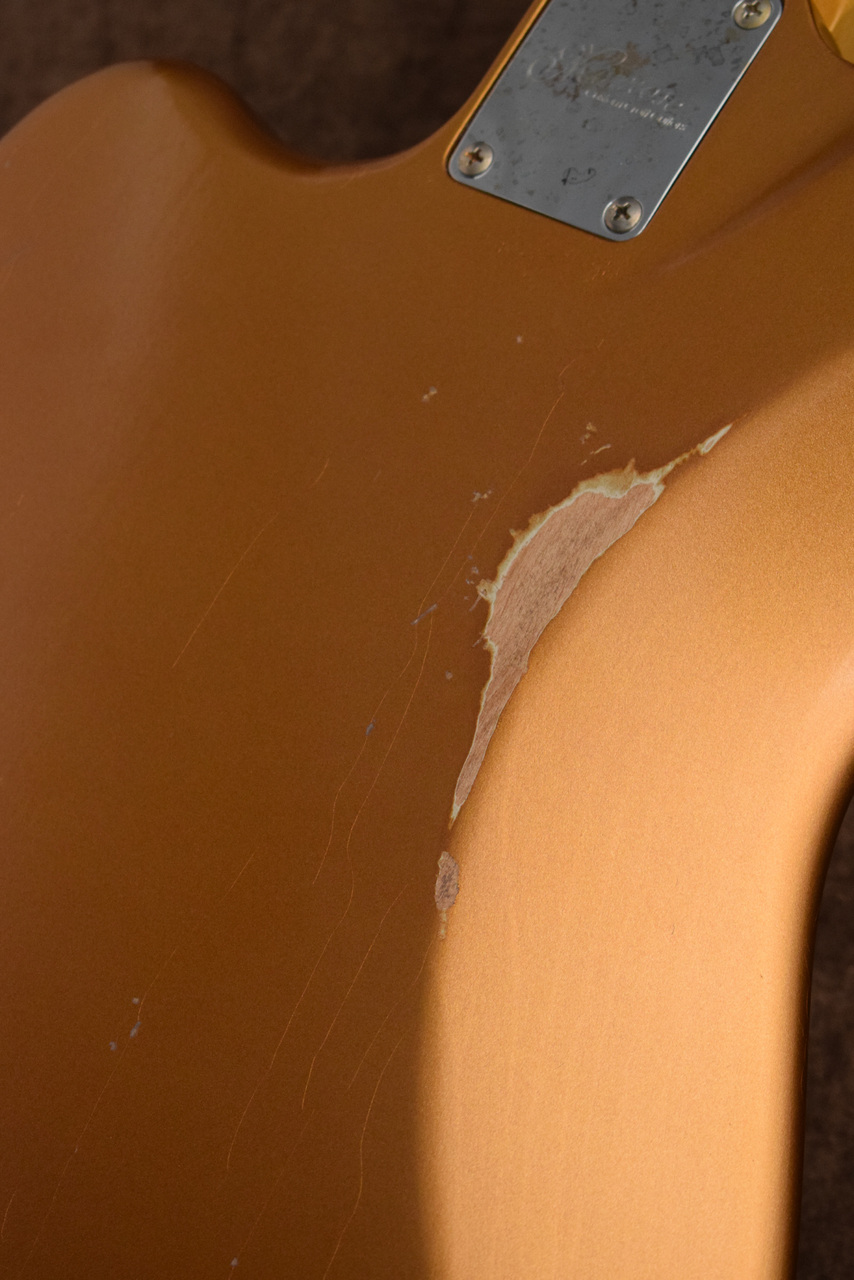 各色1本のみにて特注させていただきました。モモセのジャズマスタータイプMJS1-STD/Rを基本モデルとして、塗装をトップラッカーからオールラッカー(エイジド仕様)に、カラーは通常製造されないショアラインゴールド(マッチングヘッド)にて指定いたしました。温かみのあるゴールドの色味がGOOD!イメージ通りに製造していただき、担当のテンションも上がっております。エイジドの具合も最高です。メタリックカラーですので、程よく見えるウェザーチェックが非常にクール。ピックガードやノブなどのパーツもエイジド加工が施されており、全体的な印象もまとまって見えます。