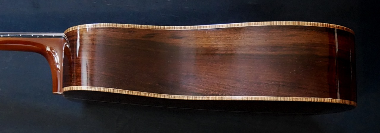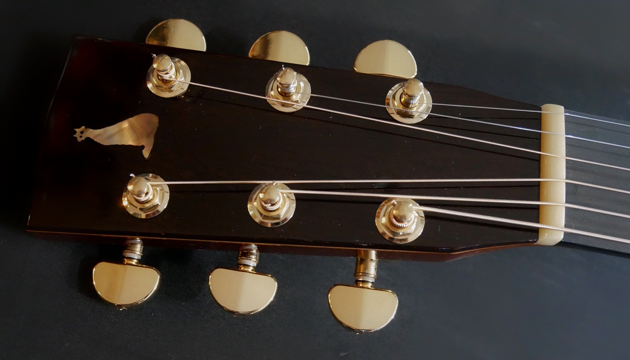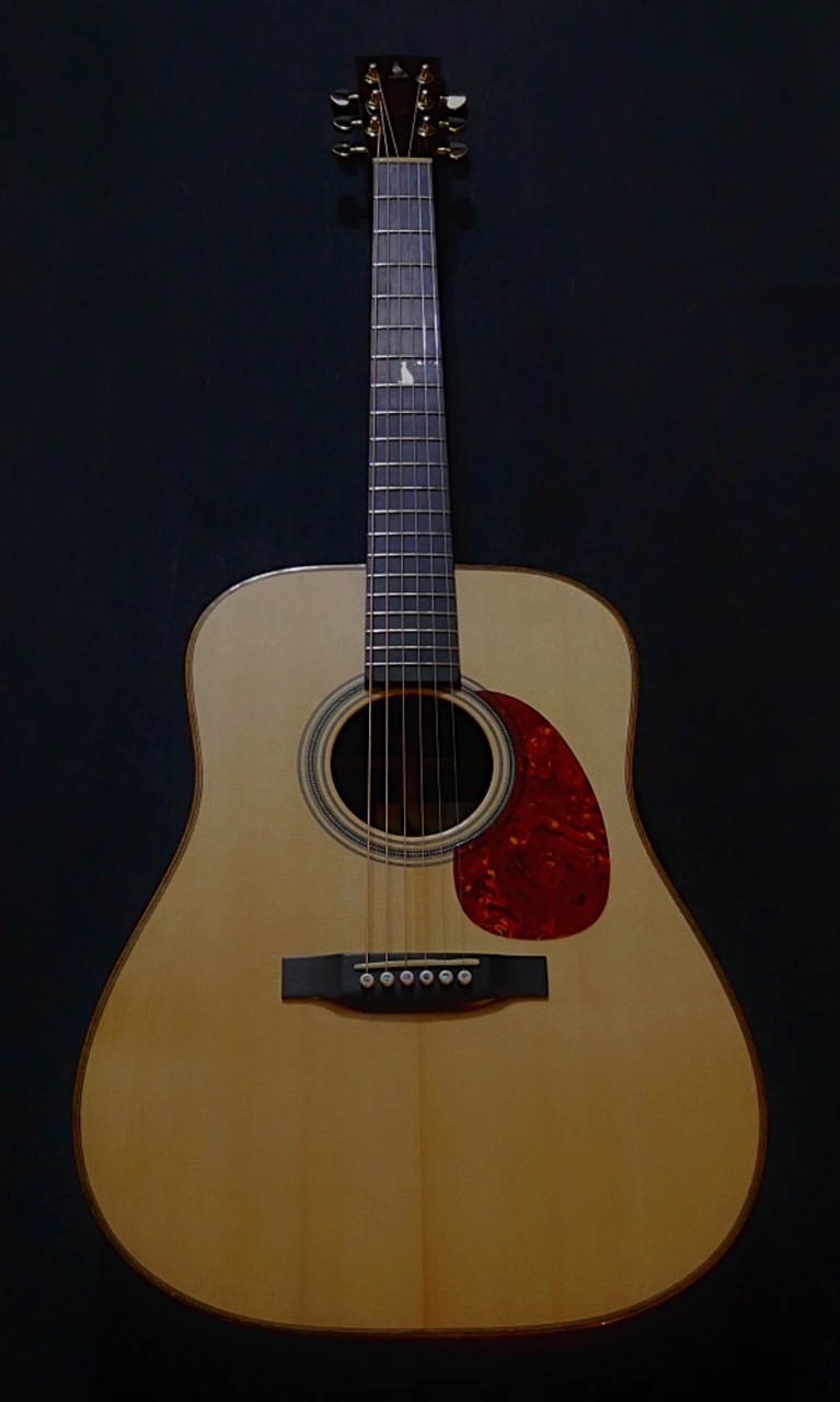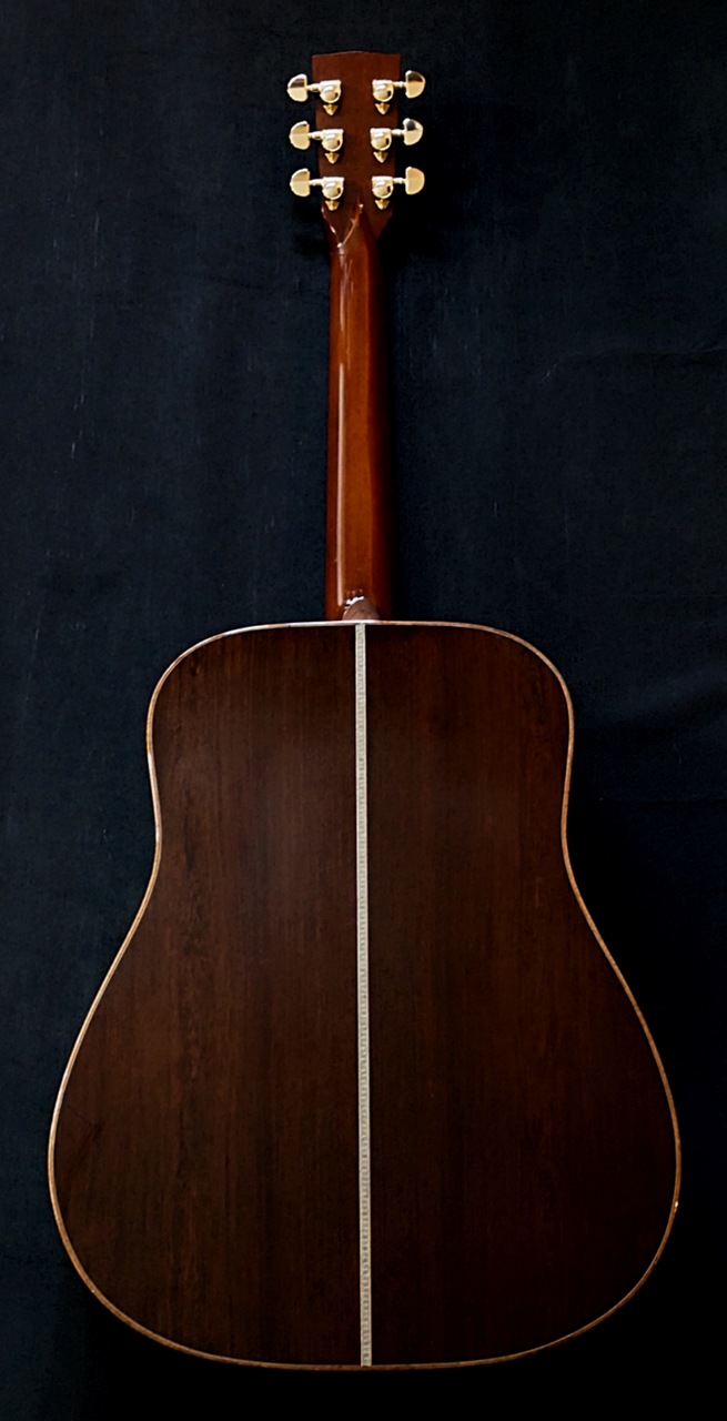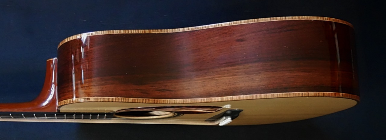 本器のボディサイズは、ドレッドノート。トップにはプレミアムグレードのイタリアンアルパインスプルースを使用、そしてサイド&バックには、プレミアムグレードのマダガスカルローズウッドを使用、そして通常のメーカー、製作家には真似のできない重厚なボディーとして組み上げられております!!極上ホンジュラスマホガニーのネックとトップ、サイド、バックとが沖田正和の手によるスペイン式ネックジョイント方式で見事に組み合わさり通常では考えられないバランシングと剛性の高い音の出力、イタリアンアルパインスプルースならではの美しく説得力と音色感のある魅惑のサウンドを見事に出力、実現しております。本器の特徴としては、カスタムオーダーモデルにより、指板の7フレットにOKITA GUITARSのシンボルの猫とOKITAのインレイが。サウンド的特徴として、オプションのノンスキャロップドXブレーシング仕様により、スキャロップモデル以上に大変厚みとパワーのあるサウンドを出力いたします。またOKITA GUITARSのさらなる特徴となる生音そのものにおいても、抜群のバランシング、絶妙なコード感の、正確なピッチ、その素晴らしさと完成度の高さにで、ライブ、録音時とあらゆる音楽ジャンル、奏法、運用においても安心して音楽を委ねることを可能にした唯一無二の夢のギターです!!!