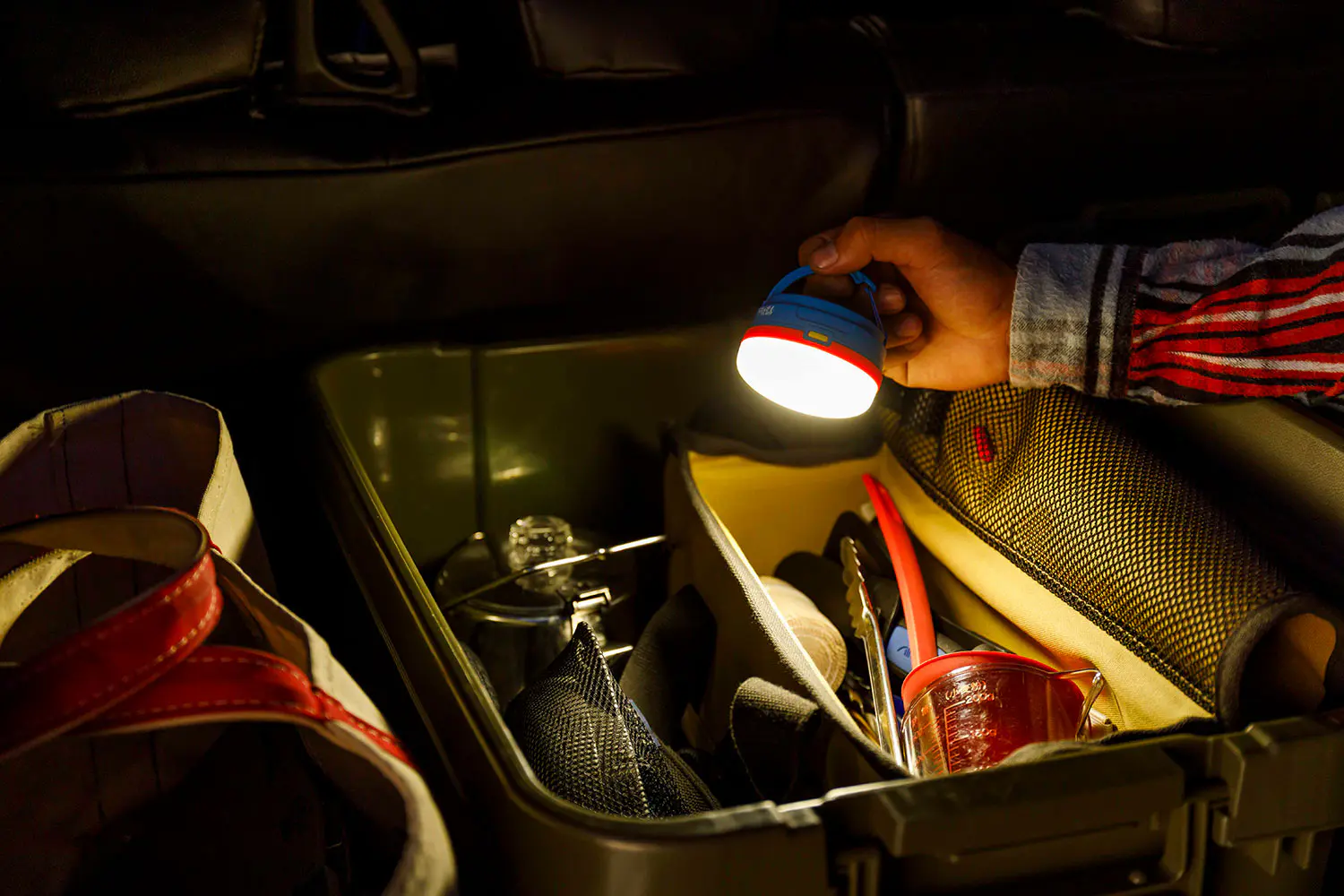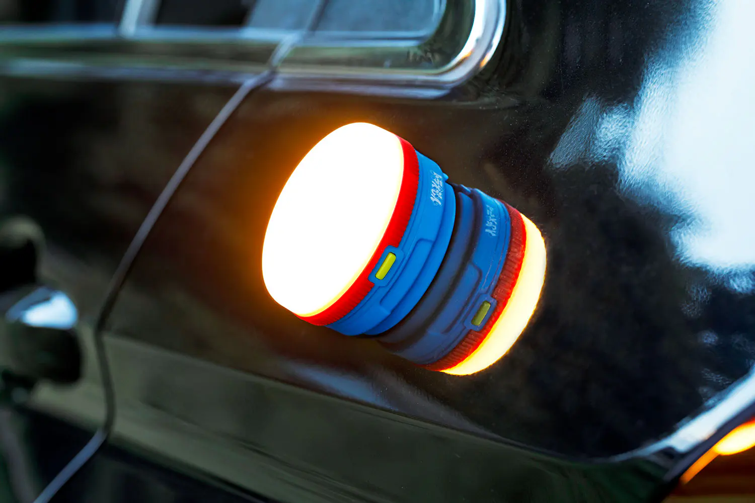 最初の機能は4種類の点灯モード。TPOによって明るさや光り方を切り替えられる。また、上部のカラビナも万能。テントに吊るせばちょっとした室内灯になり、バッグに取り付ければ夜道を照らすことができる。