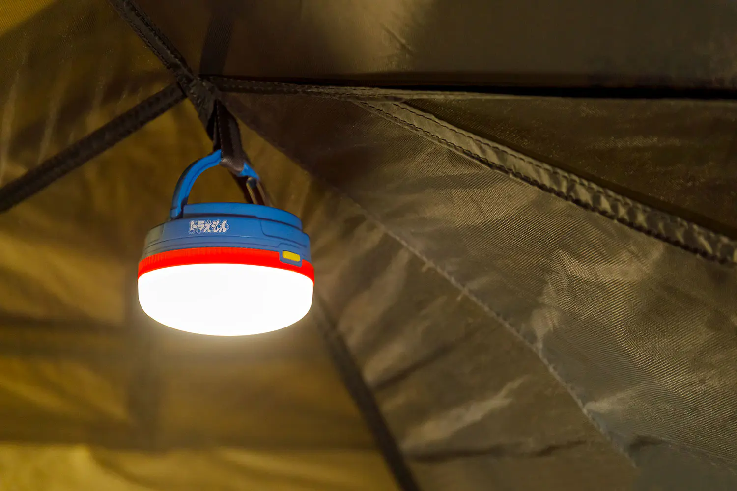 フォルムはドラえもんの鈴のようで、配色も「ドラカラー」の、このランタン。持っているだけでもテンションが上がるかわいらしさだが、まさに「ひみつ道具」といえる秀逸なギミックの数々を搭載する。