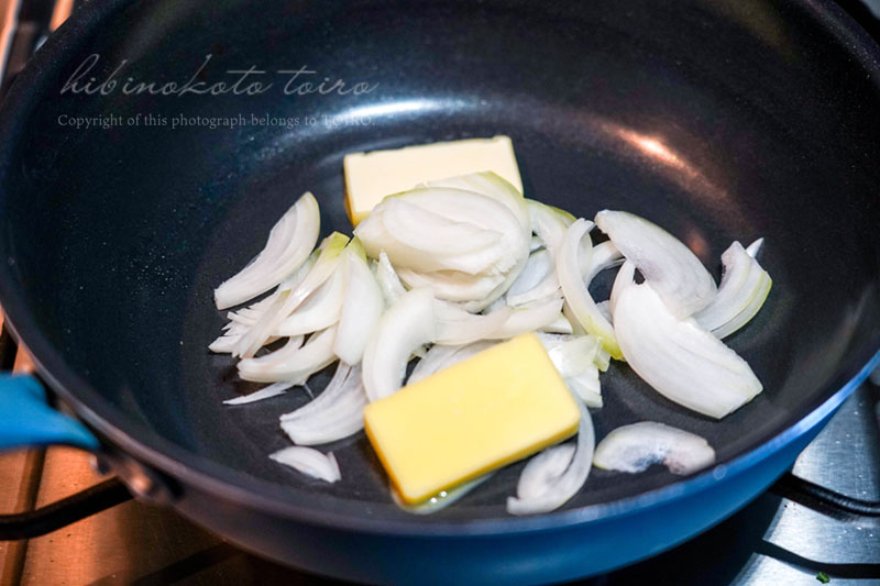 タマネギを加えてしんなりと透き通ってくるまで炒めます。