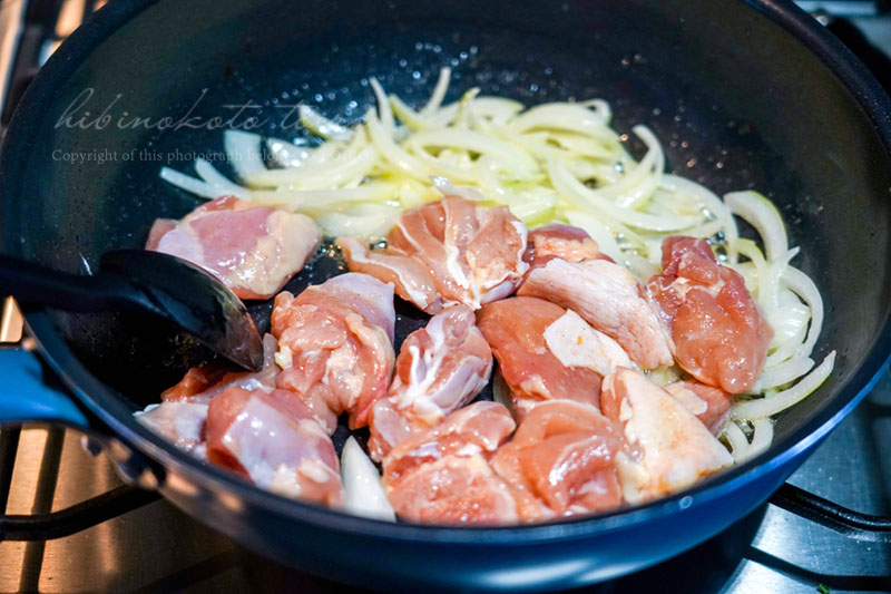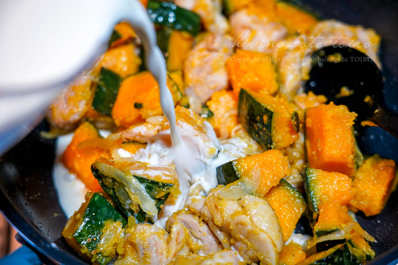 鶏肉に8割ほど火が通ったら、カボチャを加えてさらに炒めます。