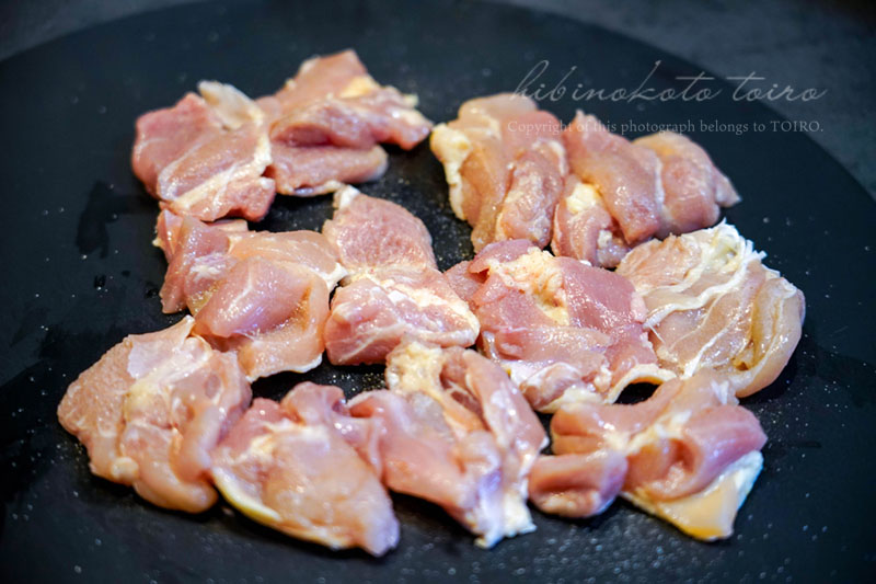 鶏もも肉も1枚を一口大にカットして、両面に塩胡椒をしてスタンバイ!