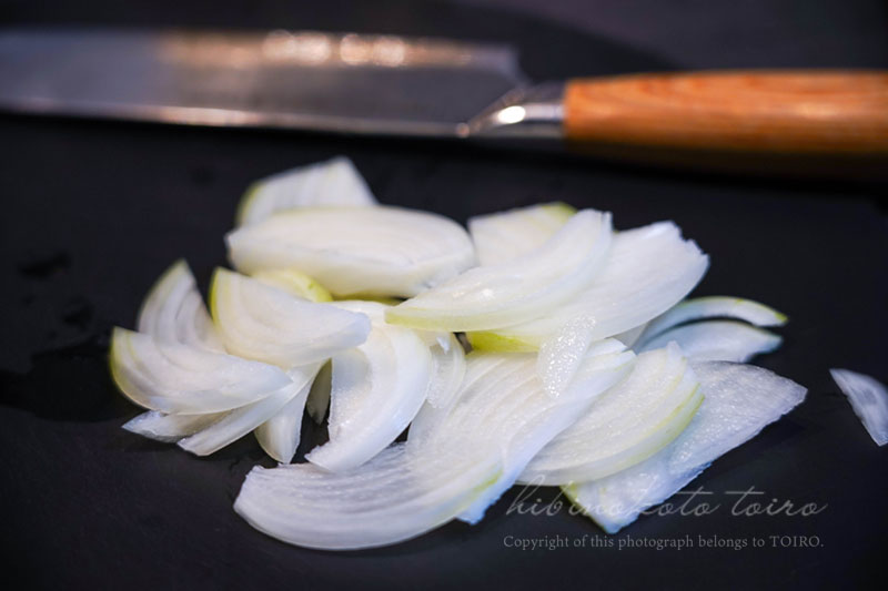 加熱中に玉ねぎ(1/2個)の準備。