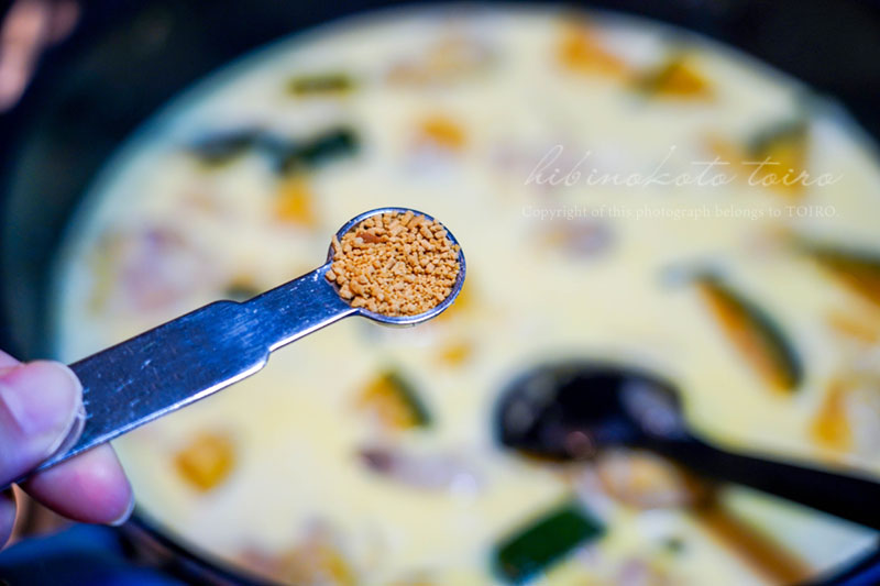 あまり濃い味に仕上げてませんが、もう少し濃い方がいいなっていう場合は、コンソメか塩で調整してください。