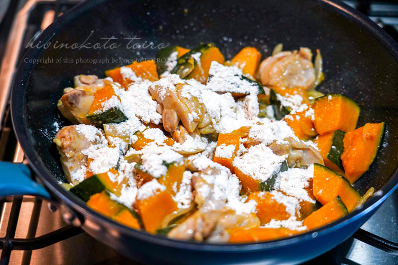 小麦粉を大さじ2ほど全体にふりかけて、粉けがなくなるまで炒めます。