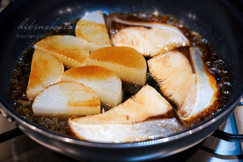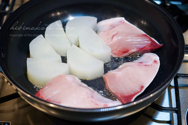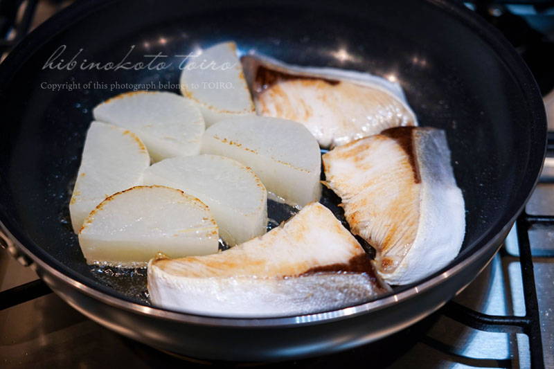 フライパンにサラダ油を小さじ2ほど入れて中火にかけ、ブリと大根(水気を拭いてね)を焼き付けます。