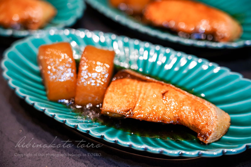 あんまり長時間煮ると魚が硬くなってしまうので、ある程度色もついたところでブリは先に器に盛り付けます。(大根も表面にいい色がつけば取り出して◎)