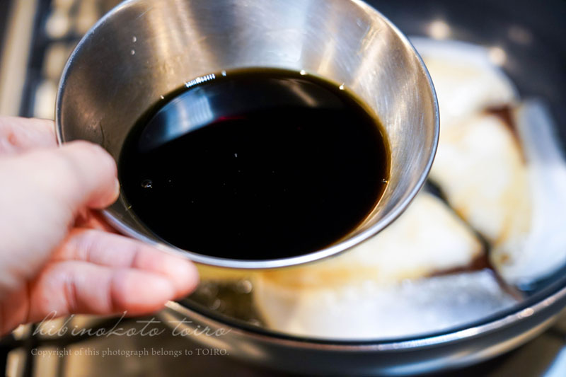 醤油と、みりんと、酒を各大さじ2を合わせて加えます。