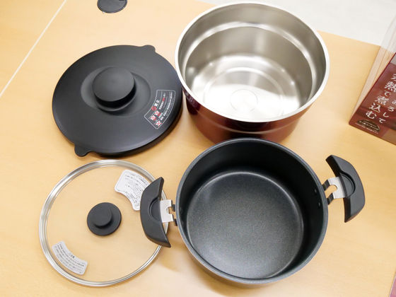 さらにシャトルシェフ本体の保温容器のフタを開けてみると、保温容器本体や調理鍋のフタ、調理鍋本体が収納されていました。